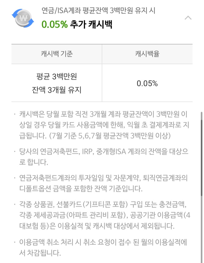 - 연금 및 ISA 계좌에서 3개월 계좌 평균 잔액 3백만 원 유지하면 0.05% 추가 캐시백 혜택을 제공합니다.