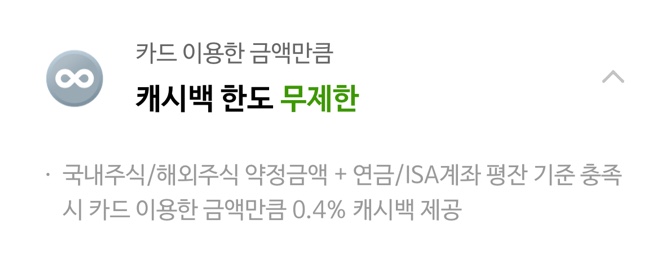 - 국내주식 약정 1백만 원 이상이면 0.1% 캐시백 혜택, 해외주식 약정 1백만 원 이상이면 0.25% 캐시백 혜택을 제공합니다.