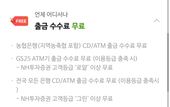 - 농협은행(지역농축협 포함) CD/ATM 출금 수수료 무료 혜택, NH투자증권 고객등급 로얄이면 GS25 ATM 출금 수수료 무료 혜택, NH투자증권 고객등급 그린이면 전국 모든 은행 CD/ATM 출금 수수료 무료 혜택을 제공합니다.