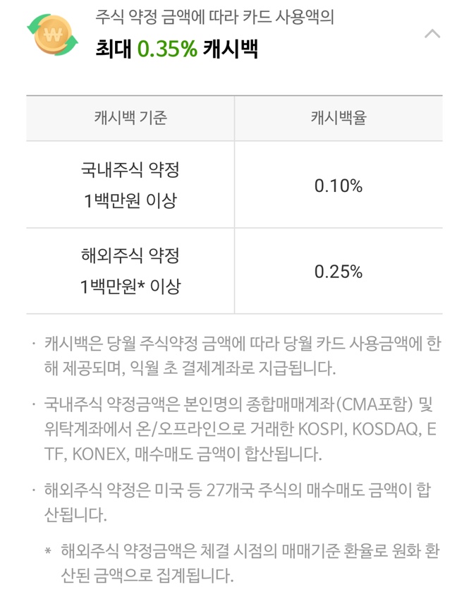 국내주식 약정 1백만 원 이상이면 0.1% 캐시백 혜택, 해외주식 약정 1백만 원 이상이면 0.25% 캐시백 혜택을 제공합니다.