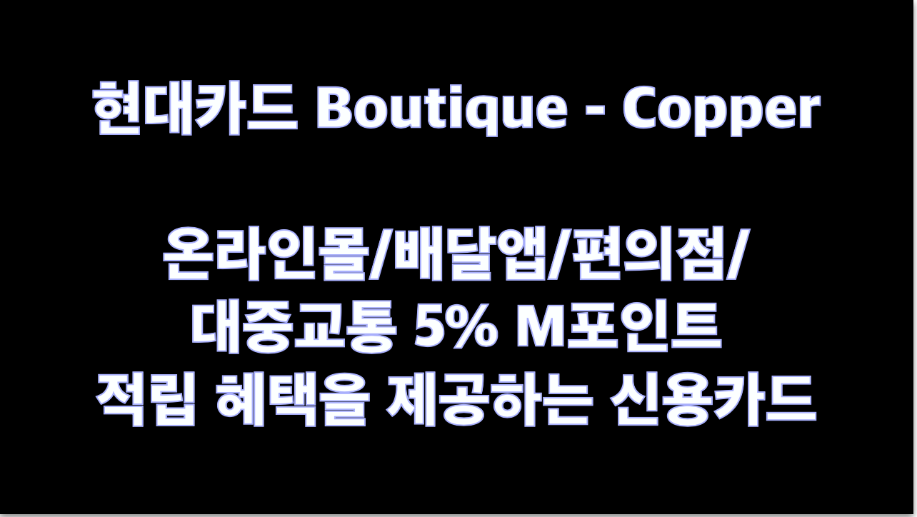 - 2025년 1월 6일 출시한, 온라인몰/배달 앱/편의점/대중교통 5% M포인트 적립 혜택을 제공하는 현대카드 부티크 - 코퍼입니다.