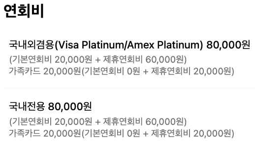 - 국내외 겸용(VISA Signature) 및 국내 전용 연회비는 80,000원입니다.