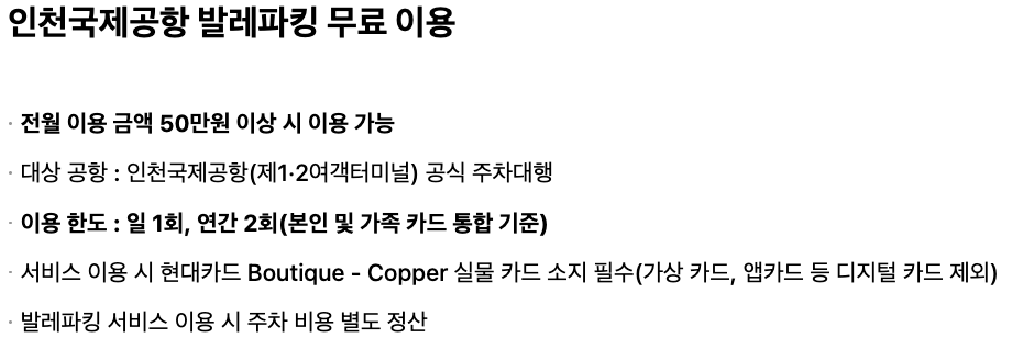 전월 이용 금액 50만 원 이상이면 일 1회, 연 2회 인천국제공항 발레파킹 무료 이용 혜택을 제공합니다.