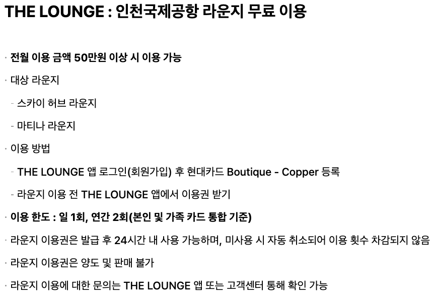 - 전월 이용 금액 50만 원 이상이면 일 1회, 연 2회 인천국제공항 라운지 무료 이용 혜택을 제공합니다.