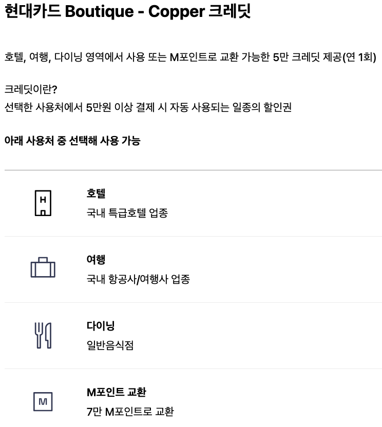 현대카드 부티크 코퍼는 온라인몰/배달앱/편의점/대중교통 5% 적립 혜택, 호텔/여행/다이닝 5만 크레딧 제공 혜택, 국내외 가맹점 1.5% 적립 혜택을 제공합니다.