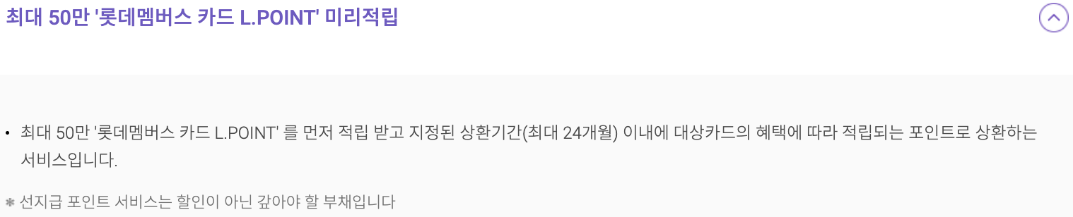최대 50만 엘포인트를 먼저 적립받고 지정된 상환기간(최대 24개월) 이내에 대상 카드의 혜택에 따라 적립되는 포인트로 상환하는 혜택을 제공합니다.