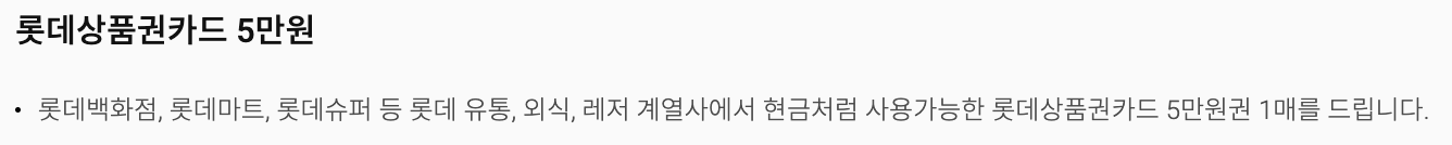 - 카드발급 첫해에는 일시불 및 할부 이용 실적 500만 원 이상 이용하고, 카드발급 첫해 이후에는 지난해 일시불 및 할부 이용 실적 2,000만 원 이상 이용하면 롯데상품권카드 5만 원권 1매를 제공합니다.