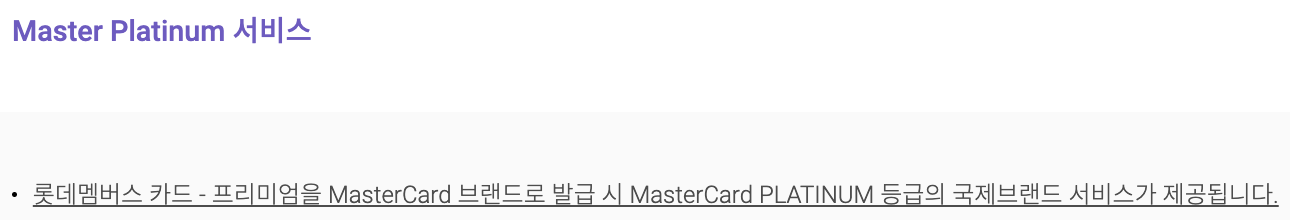 - MasterCard 브랜드로 롯데멤버스 프리미엄 카드를 발급하면 마스터 플래티넘 서비스를 제공합니다.