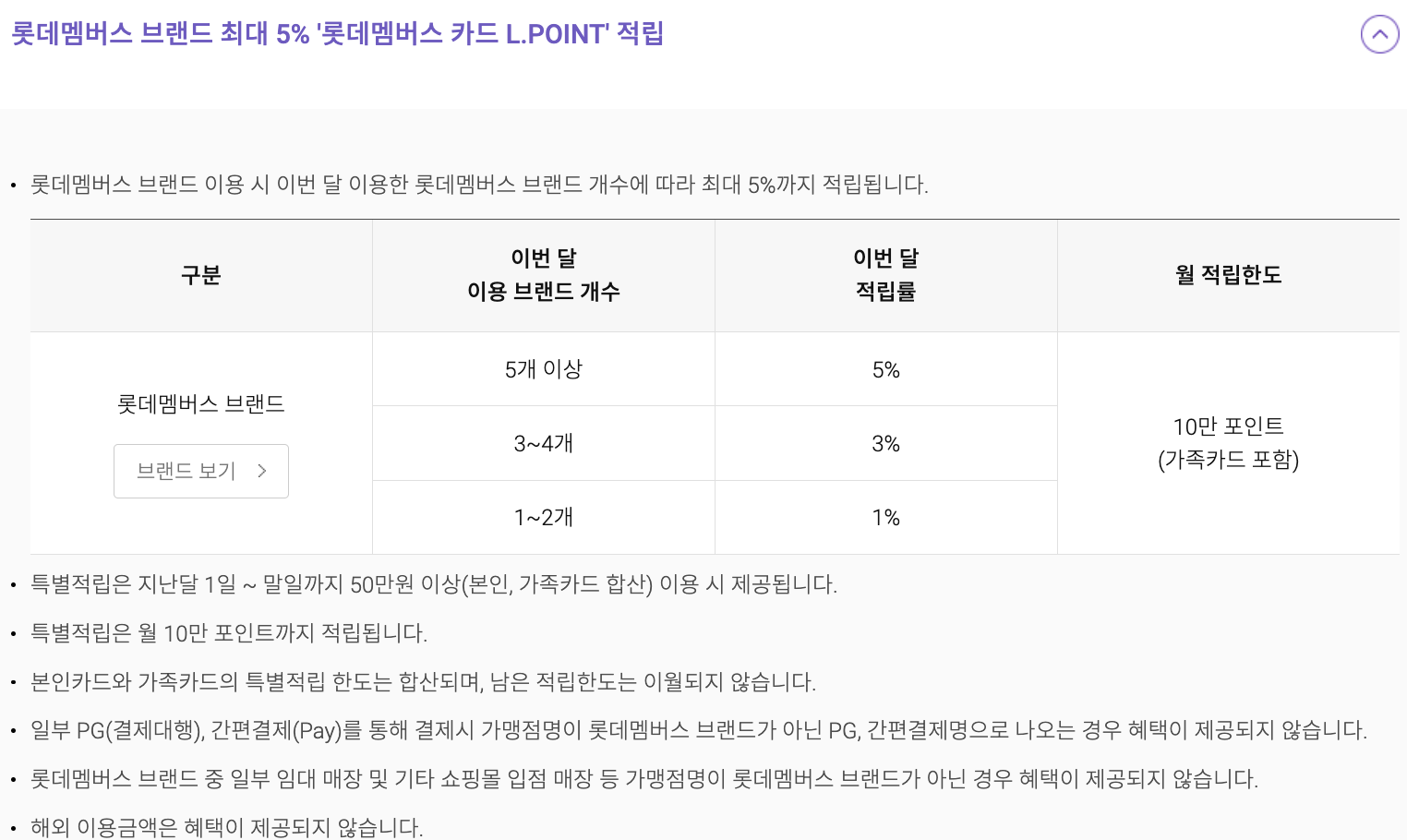 - 전월 50만 원 이상 이용하면 이번 달에 이용한 롯데멤버스 브랜드 개수에 따라 월 10만 포인트까지 엘포인트 최대 5% 적립 혜택을 제공합니다.